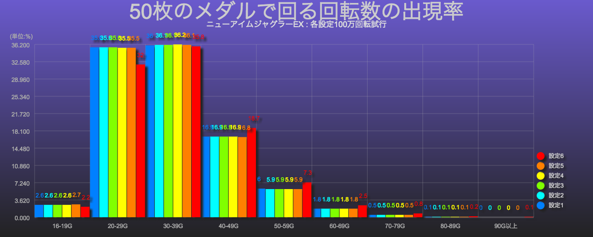 今回は、この50枚あたりの回転数分布を設定ごとに纏めてみました。