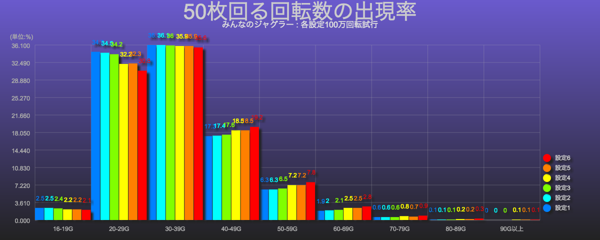 今回は、この50枚あたりの回転数分布を設定ごとに纏めてみました。