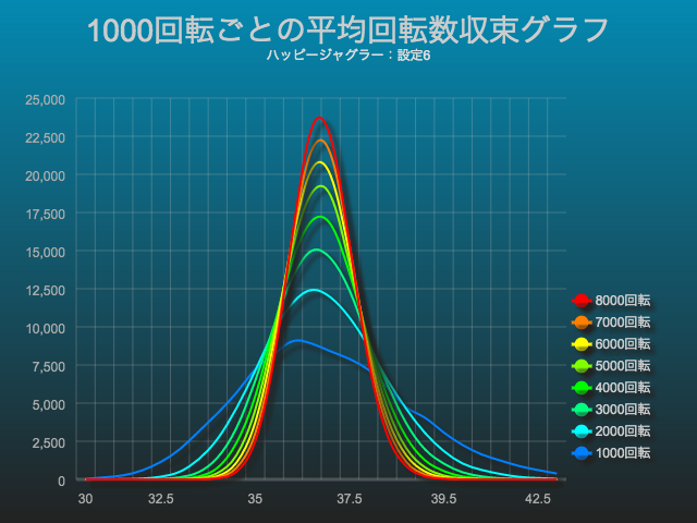 先ほどのグラフは、設定6でのブドウ確率を1000回転ごとに見ましたが、