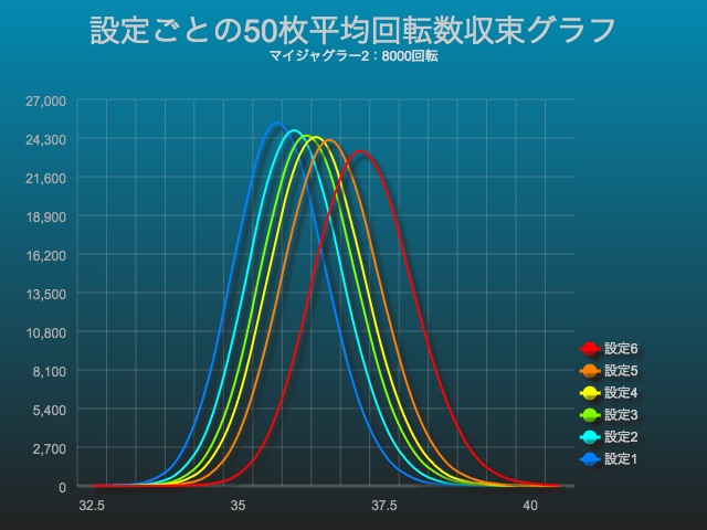 設定ごとの収束グラフを見ると、マイジャグラー2では、