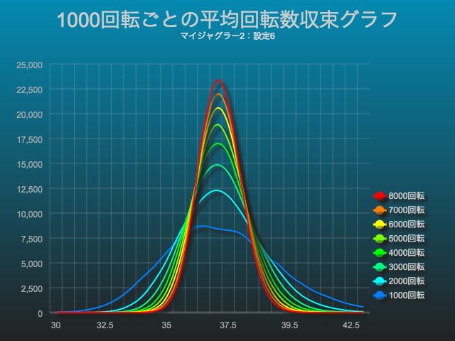 先ほどのグラフは、設定6でのブドウ確率を1000回転ごとに見ましたが、