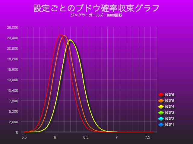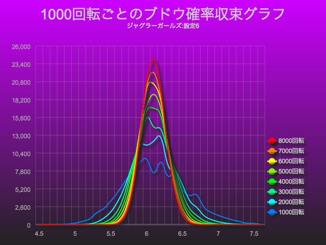 先ほどのグラフは、設定6でのブドウ確率を1000回転ごとに見ましたが、