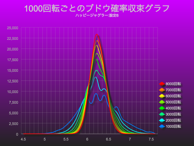 先ほどのグラフは、設定6でのブドウ確率を1000回転ごとに見ましたが、