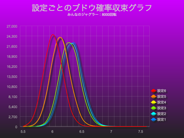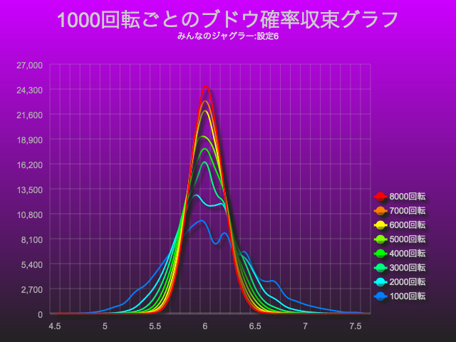 先ほどのグラフは、設定6でのブドウ確率を1000回転ごとに見ましたが、