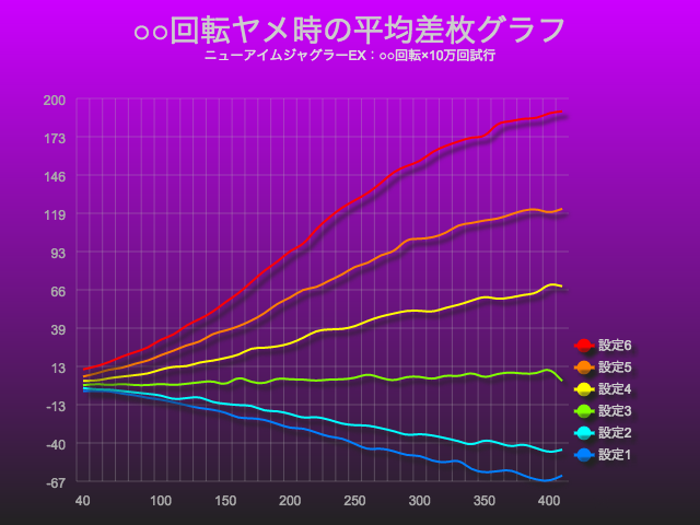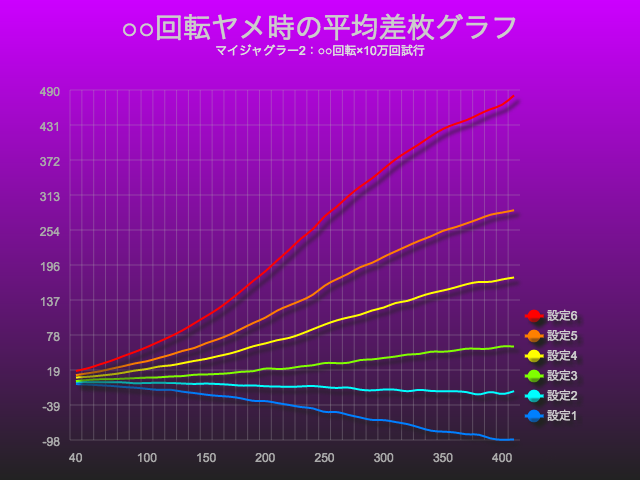 うなぎ上りだった設定6の平均差枚数のラインが250回転あたりから、緩やかになってくるのが分かります。