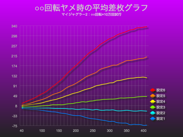 縦軸:平均差枚、横軸:ヤメゲーム数、上限は8000回転に設定、それぞれ10万回試行